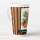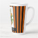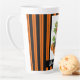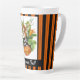 Welcome the Fall season with this whimsical latte mug featuring a watercolor illustrated woodland harvest elf / nymph perched on large pumpkins with orange and black striped background and a customizable text strip at the bottom