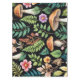Tablecloth features mushroomcore artwork with forest flora and fungi in a pattern style against a black background. Flower blooms, ferns, toadstool mushrooms, and more in shades of green, brown, orange, pink, and purple, overall on the warmer side. Dark cottagecore or goblincore aesthetic.