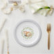 Sweet personalized plates for your woodland or nature themed baby shower feature a pale grey border, with a watercolor fox in the center, curled up inside a wreath of green eucalyptus leaves and foliage. Personalize with the mama-to-be's name and shower date.