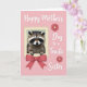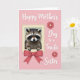 This card features a tall layout with a soft pastel pink background that feels gentle and affectionate ❤️. Centered on the front is a small masked woodland animal with dark eye markings and soft brown-and-gray fur, looking straight out with an open, tender gaze. The animal sits inside an ornate antique-gold frame, and its tiny dark claws curl over the lower edge as if it’s leaning forward to share a quiet moment with you. Below the frame, a large deep red bow with full loops and long trailing ribbons adds a romantic, gift-like touch. Along the right side, a short message appears in white flowing lettering, spaced neatly so it balances the main illustration without crowding it. Two small red flower accents with layered petals sit near the lettering like little blossoms tucked beside a note 🌼. The lighting stays soft and diffused, and the gold frame, plush fur, and smooth ribbon each show subtle texture against the pink backdrop. The deep red bow sits directly under the frame, with ribbon tails pointing downward across the lower portion of the design.