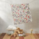 This sweet cottagecore nursery design features hand drawn woodland scene of a hedgehog and snails, butterflies, whimsical flowers, botanical ferns, mushrooms, and fall leaves in an autumn inspired color palette of deep fern green, light sage, oranges, yellows, and reds with a coordinating vintage inspired pink, red, and green floral pattern on the back. It can be customized with your baby's initial and name.