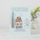 Housewarming party invitations with woodland home doodle drawing and decorative typography. The mixed media drawing has a cozy house, pine trees and a little bird in a soft color palette of green, blush, brown and grey. The wording reads "please join us for a housewarming party at our new neck of the woods" along with your invitations details.