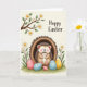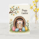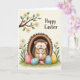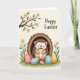 This card shows two small spiny woodland creatures nestled in a snug, burrow-like nook, with the larger one gently holding the smaller in a way that suggests quiet friendship and care 🐰. Soft morning light washes over the scene, giving the background a pale, airy glow like early spring. In the upper left, thin branches curve inward with small white blossoms and fresh green leaves, framing the moment like a natural canopy 🌷. Near the bottom, short grass is brushed in muted greens, dotted with decorated egg shapes in pink, blue, and yellow. The creatures have rosy cheeks, and their tiny smiles and close posture create a tender, affectionate mood without needing extra flourishes. Fine strokes show the texture of their spines and fur, while the overall palette stays gentle and subdued. A seasonal greeting is placed on the right side in flowing, dark lettering that stands out against the light background. The eggs sit clustered along the lower edge beneath the pair, with a few angled slightly to show their painted patterns.