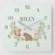 A cute woodland nursery themed wall clock with a bear, fox and rabbit.