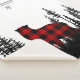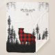 A black and white Christmas Family keepsake sherpa-fleece blanket featuring a black and white charcoal rendering of a woodland Eastern pine tree forest with a large red buffalo bear at centre, and your family name and year of Christmas in a lovely script writing along the top.