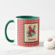 This pair of lovely cardinals want to help cheer you up when you drink your morning coffee or sip your afternoon tea. The mug background is a cheery gingham-like farmhouse chic plaid, and the cardinal is framed in a contrasting Christmas green. The mug owner's name appears in a red typeface script, so make sure to your or your recipient's name in the Personalize section. If you love watching cardinals in the forest or even your backyard, this rustic country-style cup might remind you of those lovely bright red birds. This design comes on several different styles of mugs, glassware, and drinkware. The choice here includes a green handle and green interior, but you can opt for mug with a plain handle and interior.