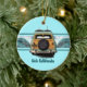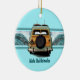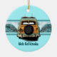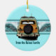 A vintage woody equipped with a pair of longboards, finds the perfect double breaking wave. The illustrated wave has a ghost image of a hibiscus pareau print. The vintage California license plate says Beachin'. For Christmas, our greeting is "Mele Kalikimaka", but these ornaments make great gifts year round, customize them with your own message! These designs comes several colorways.