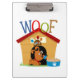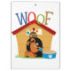 A cute dog with a ball and dish of food, a dog house, and colorful text that reads WOOF on Woof Dog T-shirts, hoodies, mugs, bags, cards, stickers, key chains, buttons, magnets, dry erase boards, electronic cases and sleeves, paper plates and napkins, and many other dog design items!