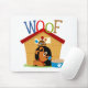 A cute dog with a ball and dish of food, a dog house, and colorful text that reads WOOF on Woof Dog T-shirts, hoodies, mugs, bags, cards, stickers, key chains, buttons, magnets, dry erase boards, electronic cases and sleeves, paper plates and napkins, and many other dog design items!