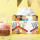 A cute dog with a ball and dish of food, a dog house, and colorful text that reads WOOF on Woof Dog T-shirts, hoodies, mugs, bags, cards, stickers, key chains, buttons, magnets, dry erase boards, electronic cases and sleeves, paper plates and napkins, and many other dog design items!