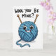 This greeting card features a bright blue ball of yarn front and center on a white background, instantly catching the eye. The yarn has a cute face with wide, happy eyes and a big smile showing its teeth, giving it a cheerful, friendly personality. Two thin wooden knitting needles stick out from the top, clearly tying the design to a cozy crafting theme. A loose strand of yarn trails from the bottom, adding a relaxed, handmade touch. At the top, the message reads “WOOL YOU BE MINE?” in black, hand-drawn block lettering that’s easy to read. The combination of the smiling yarn character and the clever pun makes this card feel warm and affectionate, perfect for Valentine’s Day or for anyone who loves knitting and sweet humor ❤️