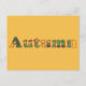 Colorful letters form the word, Autumn, and is printed on a yellow orange background, on postcards. The letters were made from an abstract fall painting of leaves by CherylsArt. The colors are green, brown, and yellow are outlined in red. Thank you for shopping CherylsArt on Zazzle.