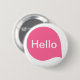 A button badge template with a stylish word bubble design with the word "Hello". However this design can also be customized with your own text, single short words or even longer texts with 3 to 4 lines by making the text smaller. You can also achieve even greater control over the text by creating a separate text object for each line the possibilities are endless. The background color can also be changed.