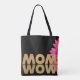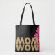 word Mom and Wow in cork letters on black mirror refection with bright pink daisy
