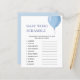 Add laughter and playfulness to your Baby Shower with our ''Word Scramble | Blue Balloon Baby Shower Game". The guests will have a lot of fun completing the list of words on this card, all related to babies, who can unscramble them first! Get yours today, and create unforgettable memories! Solution: