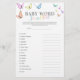 Make the 'mom to be's' shower one to remember with this cute "Word Scramble" baby shower game! Featuring a simple plain white background, watercolor pastel rainbow colored butterflies, and a editable text template. The anwers are available on the reverse.