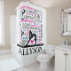 This gymnastics shower curtain features a white background covered with gymnastics terms in a variety of fonts and colors. There are 4 different gymnast silhouettes and a custom text field to personalize with a name before ordering.