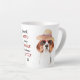 Here's the perfect latte mug for the Beagle owner! At each side is a portrait of a cute beagle dog. One is wearing a sombrero style hat, and red sunglasses. The other is wearing a dapper man's hat, and a red and white striped bow tie. Between the images is black and red text that says "I work HARD so my BEAGLE can have a BETTER life". Cute!