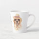 Here's the perfect latte mug for the Golden Retriever owner! At each side is a portrait of a Retriever. One is wearing a sombrero style hat, and red sunglasses. The other is wearing a dapper man's hat, and a red and white striped bow tie. Between the images is black, red, and gold text that says "I work HARD so my GOLDEN has a BETTER life". Cute!