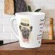 Here's the perfect latte mug for the Pug owner! At each side is a portrait of a cute Pug. One is wearing a sombrero style hat, and red sunglasses. The other is wearing a dapper man's hat, and a red and white striped bow tie. Between the images is black and red text that says "I work HARD so my PUG can have a BETTER life". Cute!