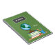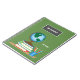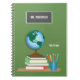 This notebook design features a graphic of a teacher's desktop including a globe, books and pencils. The background is green and can be customized to any color. Custom text allows you to add a teacher's name and grade.
