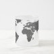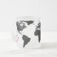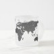 Wrap-around world map with black continents over a transparent ocean, printed on a frosted glass mug. A name can be added for a personal touch. Text and name field are fully customizable or removable.