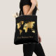 A graphic world map design by artist/designer Charmaine Paulson on a tote bag. The text used here is Garamond Bold and the color D0AA6C.