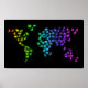 Map of the world made up of illustrations of animals. Cute and fun. Animals are colorful neon shades on a black background which really makes the colors glow.