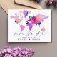 World Map Travel Destination Wedding Save the Date postcard. Customise text and heart colors to match your wedding theme. Also move the heart to your preferred destination on the map!