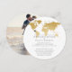 Invitation for an at-home reception after a destination wedding or elopement with an elegant faux gold foil world map and classic chic fonts with a wedding photo on the back. It's common to have a full reception or celebration after a small wedding abroad or impromptu beach wedding when your family wants to celebrate with you just the same as if you had gotten married in your home town and it's a chance to have fun with the invitations or have a travel theme reception if the couple frequently travel or met while traveling. Our globe invitations are die cut into a round shape that fit into square envelopes and really make a statement in the mail. Add one of our travel theme rsvp cards to complete the set, check out the Paper Grape Destinations Zazzle Designer Store.