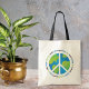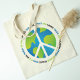 A contemporary tote bag that carries a universal message of harmony and world peace. It features an innovative design with a stylized graphic of the Earth, embraced by a white peace symbol. Surrounding this emblem, the word 'Peace' is inscribed in a multitude of languages, encircling the globe.