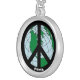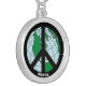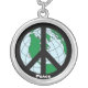 A necklace that features a World Peace theme, a Peace Symbol overlaying a globe (Earth), then has the text "Peace" to finish out the meaning.