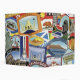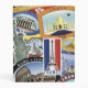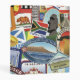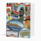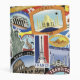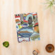 This design features a retro stylized passport on top of series of stylized vintage world travel style stickers in a overlapping collage.