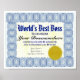 World's Best Boss Certificate Poster Print. A great certificate print for your boss with fully customizable texts "World's Best Boss", "This is to certify that:", "Your Boss' Name", "is the best boss in the world. We are blessed with a boss as caring and good as you. We love you!.", "Your Name(s) and text". This unique and personal best boss full color print is fully customizable, add your texts and images! A super personal birthday gift or retirement gift for the best boss in the world!