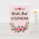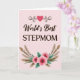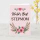 This card shows a blush pink background with the message “World’s Best STEPMOM” centered on the front. “World’s Best” appears in dark brown cursive-style lettering, while “STEPMOM” sits just below it in dark brown, all-caps serif letters that feel steady and proud. Near the top center, there’s a bright pink heart, with curling brown flourishes on each side that frame the message. Along the bottom, a row of soft pink flowers with deep red centers is mixed with teal leaves and a few feathers in warm brown and taupe. The flowers look gently painted, giving the whole design a calm, caring feel. It’s a meaningful card to give because it puts appreciation front and center, while the heart and florals add a quiet kind of love ❤️. Share it to pass along warm Valentine’s Day feelings and let her know she’s truly valued 🥰.