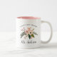 A sweet gift for your favorite teacher at year end, back to school, teacher appreciation day or the holidays, mug features a posy of peachy blush pink flowers and green botanicals, with "world's best teacher" and teacher's name in black lettering.