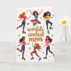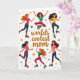Designed with a lively digital illustration, this Mother’s Day card features six stylized women on roller skates circling one another like close friends sharing an inside joke ❤️. Each figure has a different hairstyle and skin tone, and their bright smiles and open-armed poses suggest an easy closeness and support. They wear colorful sporty outfits in pink, green, yellow, and blue, adding to the upbeat, together-time feel. Centered in the middle, the words “worlds coolest mom” appear in warm golden-brown lettering, standing out as the main focal point. The background stays bright white, letting the figures and message feel airy and light. Small stars and scattered polka dots in multiple colors float around the scene like confetti, with a little extra charm from striped socks peeking above a few skates 🌼. Colorful stars and dots are sprinkled across the white space around the skaters and the centered text.