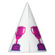 These party hats features the words "World's Greatest Mother" displaying a yearbook bold print font with purple letters plus a winners wreath with number 1 in the center over a pink colored flat style cup trophy on a purple base in this Mother's Day theme. All paper hats have an attached elastic string printed in full vibrant colors made in the USA has a Minimum of 12 order requirement.