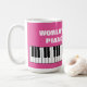 World's Greatest Piano Teacher oversized jumbo mug. Cute large neon pink and white cup for Worlds Best Piano instructor, coach or pianist. Custom thank you gift for teaching music lessons at school or home. Add your own personalized message above the piano keys. Personalized drinkware for home or office. Custom color background. Big extra large 15oz coffee mugs for him or her.