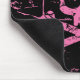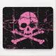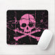These t-shirts and other items are adorned with a worn and cracked skull and crossbones in a pink and black or pink and pink color scheme.