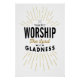 Distressed, Modern Brush Script Design typography emblem with words from Psalms 100:2, "Worship the Lord with Gladness" in black and gold letters on white background with hand-drawn accents and light rays.