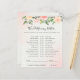 This baby shower game card features beautiful soft pastel watercolor roses and peonies in shades of blush pink and peach with lush green botanical leaves and eucalyptus.