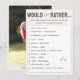 Give your guests a reason to keep their game card! Design features the ever popular "Would She Rather?" bridal shower game on one side, the photo you provide on other. Customizable for that personal touch, design features a champagne-pink background with silver-colored text. Image of clinking wine glasses is displayed near bottom. As mentioned, reverse features the photo you provide, names of Bride and Groom displayed below. Sure to be a hit at your shower!