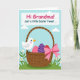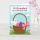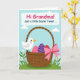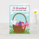 Designed with a spring scene in mind, the card centers on a woven brown basket set against a soft blue sky with scattered white clouds. A large pink bow drapes over the basket’s side, adding a gentle, affectionate touch like a ribbon tied for someone special 🌷. Resting on the rim is a small white bird with round blue eyes, rosy cheeks, and a tiny orange beak, angled as if it’s sharing a sweet note with a close friend. Inside the basket sit three decorated eggs—one pastel pink, one deep purple with light stripes, and one rich red with tiny white floral details—nestled together like a little trio. Along the bottom, green grass stretches across the foreground with white daisies and yellow centers sprinkled throughout 🐰. Near the top, a white rectangular panel with slightly rough edges holds the greeting text, with some words in bright pink and others in teal. The pink bow’s tails curl to one side beside the basket weave, while the daisies dot the grass in small clusters under the clouded sky. To share Easter sentiments.
