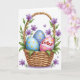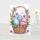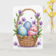 Designed with a springtime scene, the front features a woven basket in warm golden-brown tones, its over-and-under texture giving it a cozy, inviting look. Nestled inside are three decorated eggs: one pale blue with yellow dots, one deeper blue with soft stripes, and one bright pink with yellow dots that feels like the star of the group. Across the middle of the pink egg, a white band holds red lettering placed right at center, making the message easy to spot at a glance. A curved handle rises above the basket, wrapped in green vines that curl gently like they’re reaching toward each other. Small purple flowers with five petals and orange-yellow centers bloom along the vines, adding a tender, friendly touch 🌷. Around the basket, tiny purple hearts float in the open space, like little notes of affection drifting nearby 🐰. The background stays white and uncluttered, with blues, pinks, greens, and purples standing out clearly.