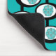 This mouse pad has a Mid-Century Modern design of lines making circles inside ovals strung together in turquoise, black, and, white.