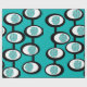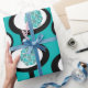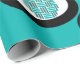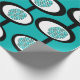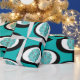 This wrapping paper has a Mid-Century Modern design of lines making circles inside ovals strung together in turquoise, black, and, white.