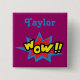A lively comic theme button, this item features a purple background with "Wow" written in yellow font on a blue and red star shaped background. The top features the recipients name/text in blue. Customize yours today!