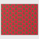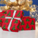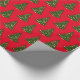 Holiday gift wrapping paper shown in a red background color with a festive Christmas tree print.