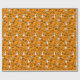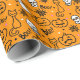 Wrapping Paper with a modern minimalist design for Halloween, a pattern of silhouettes of skulls, ghosts, cobwebs, a silhouette of a cat, pumpkins on an orange background.